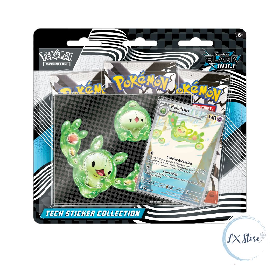 ¡Fusiona mente, estrategia y estilo con la Black Bolt Tech Sticker Collection! Este set especial del JCC Pokémon combina la fuerza psíquica de Reuniclus con un diseño tecnológico increíble. Obtén una carta promocional holográfica, una hoja de pegatinas tech resistentes con toda su línea evolutiva y 3 sobres de mejora de la expansión Escarlata y Violeta – Llama Negra.