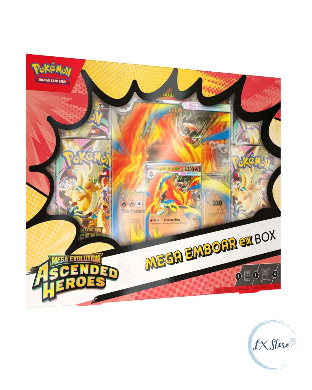 La Caja Mega Pokémon ex reúne a tres Pokémon iniciales icónicos en su forma más poderosa: Mega Emboar ex. Cada caja ofrece una experiencia única, ideal para entrenadores que buscan cartas llamativas, contenido jugable y piezas especiales para su colección.